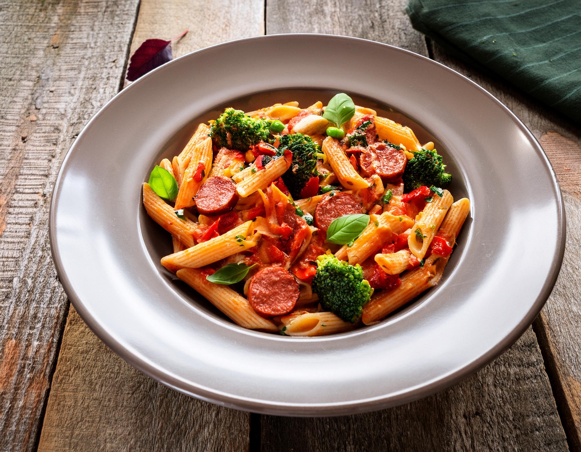 Penne tossed with roasted mild chorizo, tender zucchini, and crisp broccoli in a rich tomato‑and‑basil sauce, finished with a generous grating of Parmesan. Homestyle comfort with a little spicy-sweet chorizo kick—no preservatives